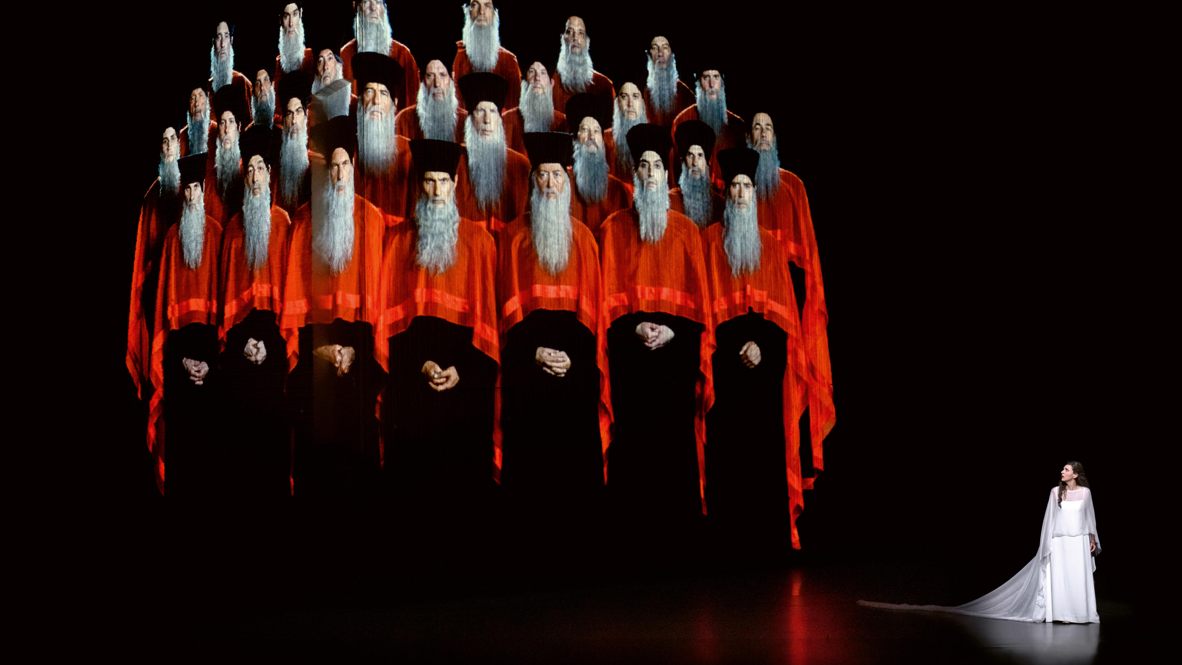 Le dispositif abstrait conçu par Christian Schmidt (un vaste plateau tournant sur lequel sont disposés deux grands éléments cubiques ouverts sur deux côtés), sert d’écran aux projections, le plus souvent en noir et blanc, de la cinéaste et plasticienne. Si elles se fondent dans l’esthétique monumentale du grand opéra et servent la poésie visuelle de l’ensemble, les images de Shirin Neshat – des territoires écrasés de soleil, des scènes de guerre et d’exactions – augmentent surtout la profondeur de champ du livret, porteuses d’une réflexion sur l’Histoire et ses bégaiements tragiques. Des images puissantes, comme les regards des hommes et des femmes qu’elles plantent dans les nôtres pour conjurer le silence et l’oubli.